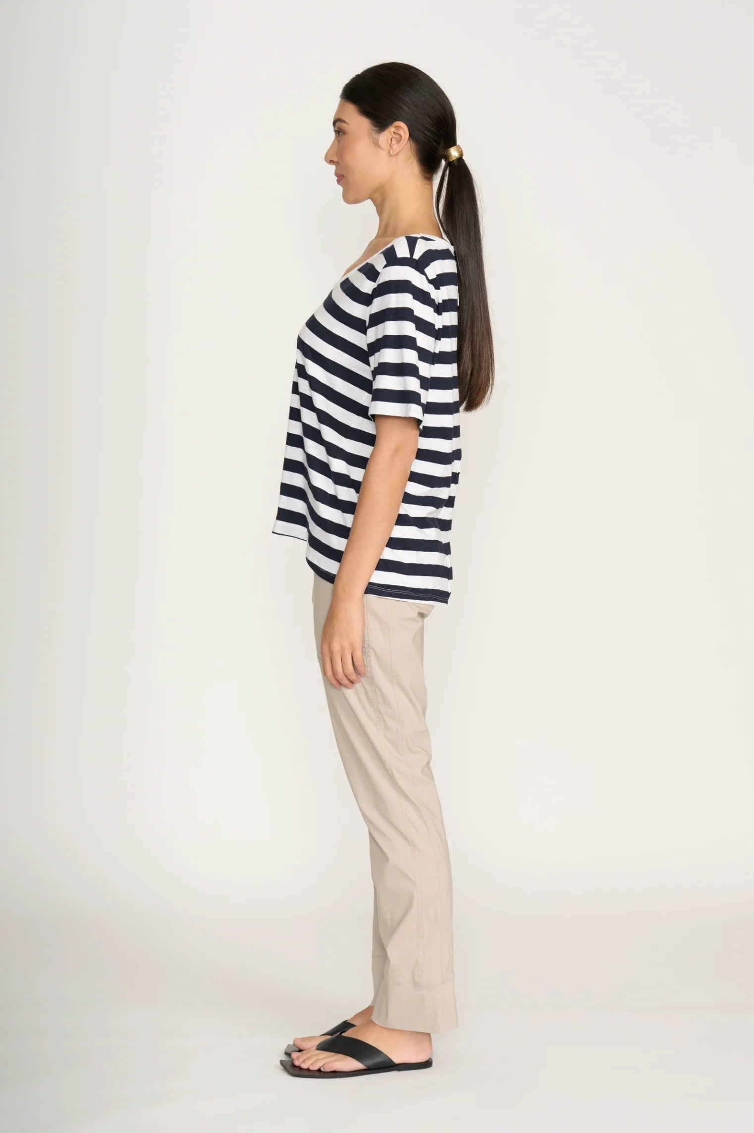 It has a long tapered leg with a cuff that can be left long or cuffed to show a bit of ankle.